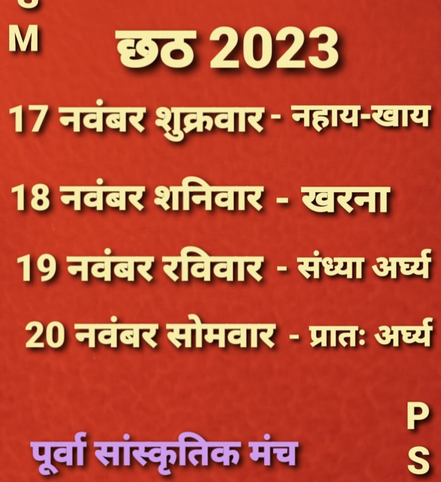 ज्ञात हो कि पूरब-बिहार के लोगों का विश्व विख्यात का चार दिवसीय छठ महापर्व 17-20 नवंबर तक नहाय-खाय से प्रारंभ होकर सोमवार 20 नवंबर के प्रातः अर्घ्य के पश्चात समाप्त होगा!