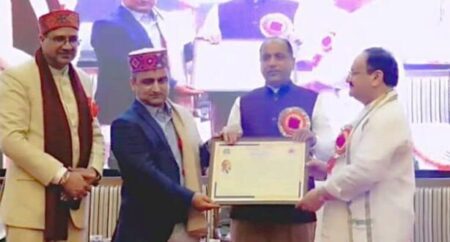 शिमला। अंतरराष्ट्रीय ख्याति प्राप्त मीडिया शिक्षक प्रोफेसर मनीष वर्मा को उच्च शिक्षा में उनके योगदान के लिए हिमाचल प्रदेश विश्वविद्यालय शिमला में सम्मानित किया गया। समारोह के मुख्य अतिथि भाजपा के राष्ट्रीय अध्यक्ष जेपी नड्डा और जय राम ठाकुर, मुख्यमंत्री हिमाचल प्रदेश द्वारा पुरस्कार प्रदान किया गया।
